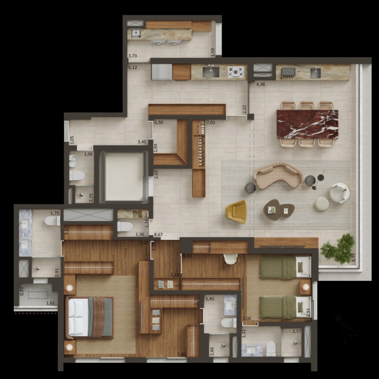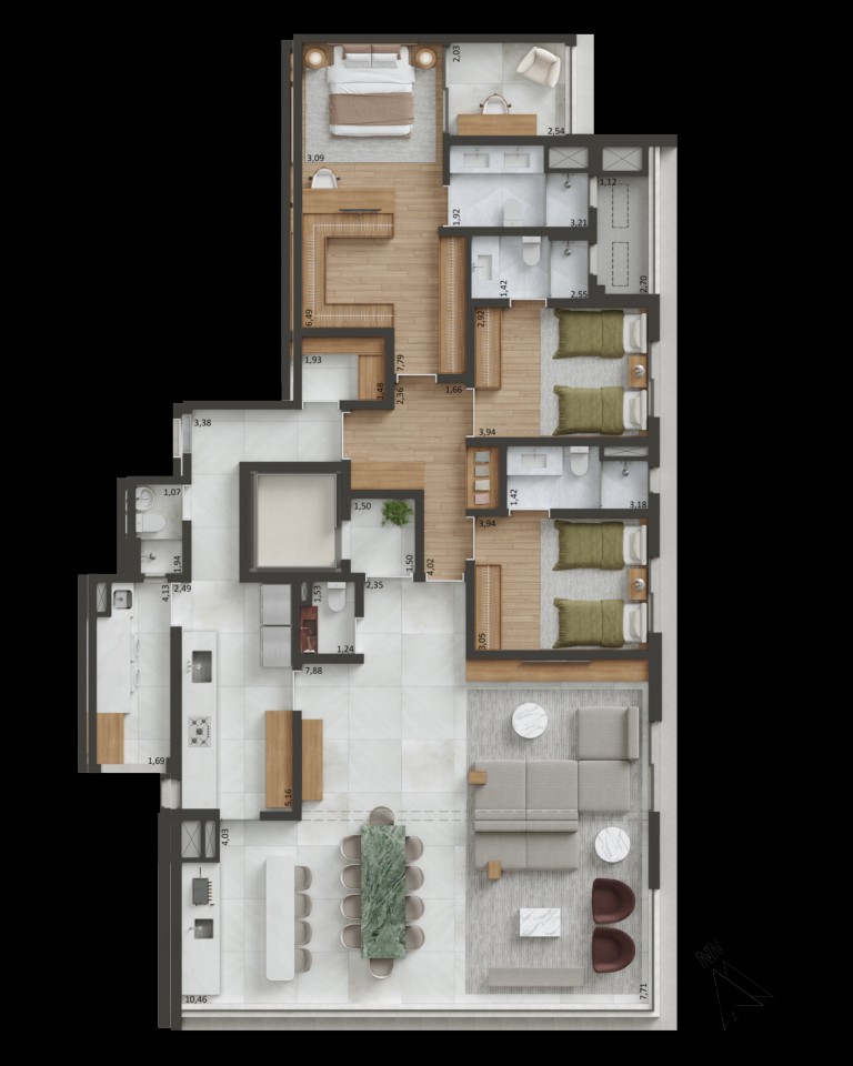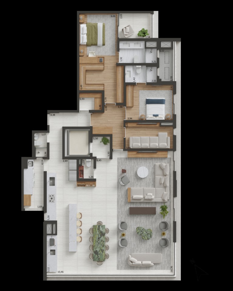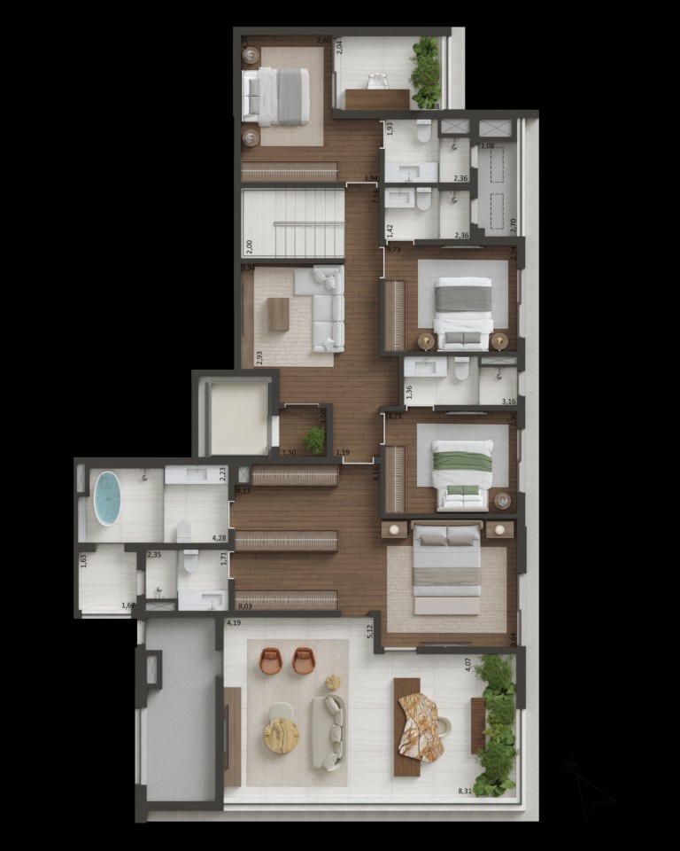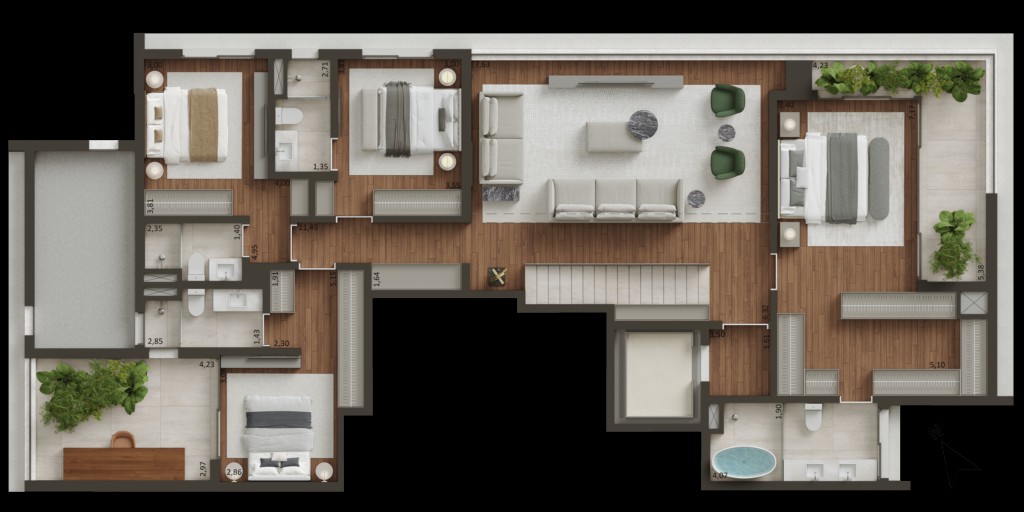🏡 Unidades Exclusivas – Apartamentos de 163 m² a 230 m² e coberturas de até 428 m², com hall social privativo.